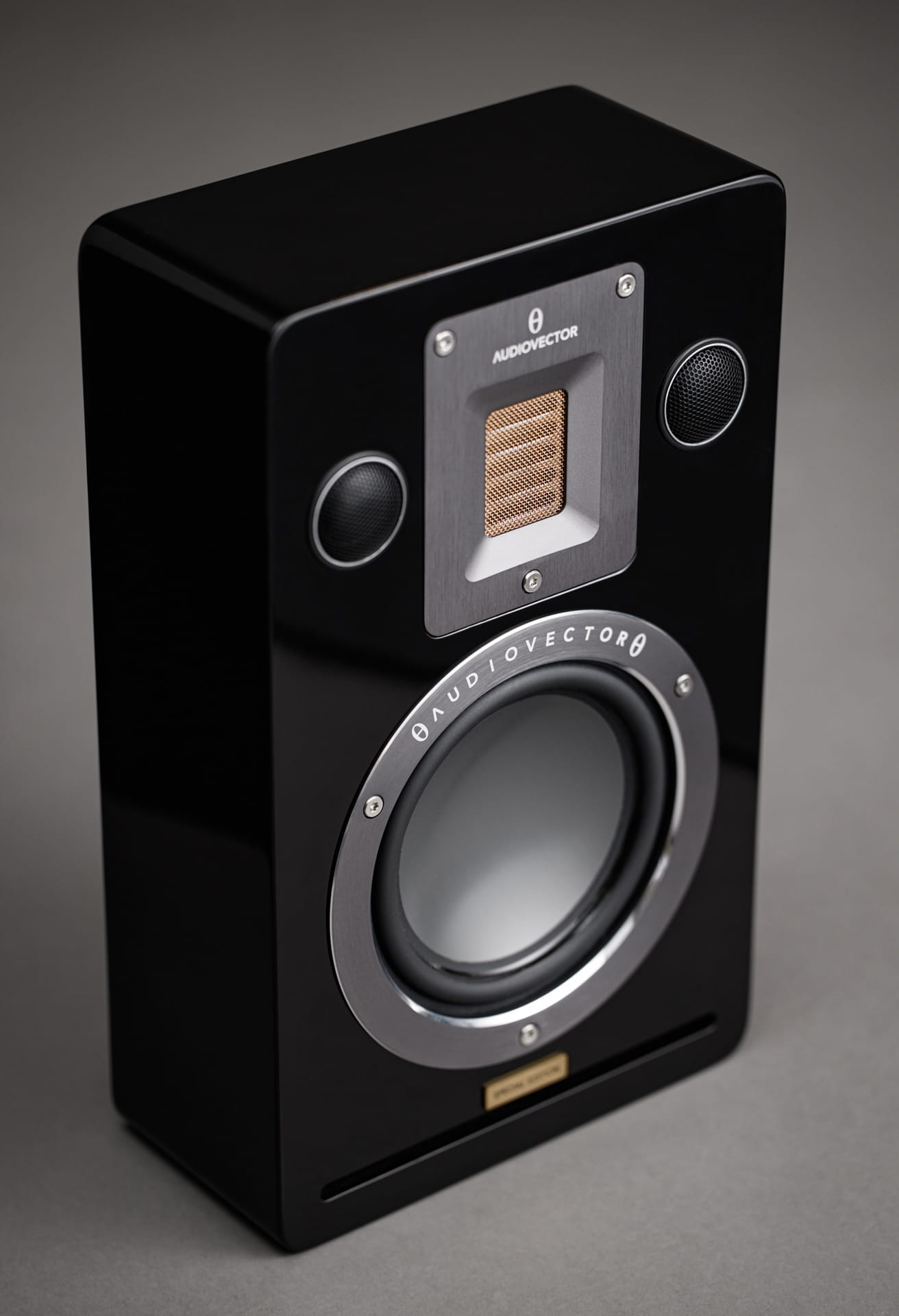 Płyta czołowa naszego głośnika wysokotonowego Gold Leaf Air Motion jest wykonana z pojedynczego płata aluminium lotniczego. Został on precyzyjnie wycięty, piaskowany, szczotkowany, a następnie anodowany w atrakcyjnym kolorze Tungsten Titanium Grey. Z przodu umieściliśmy siatkę dyspersyjną pokrytą różowym złotem, która działa jak filtr S-Stop.