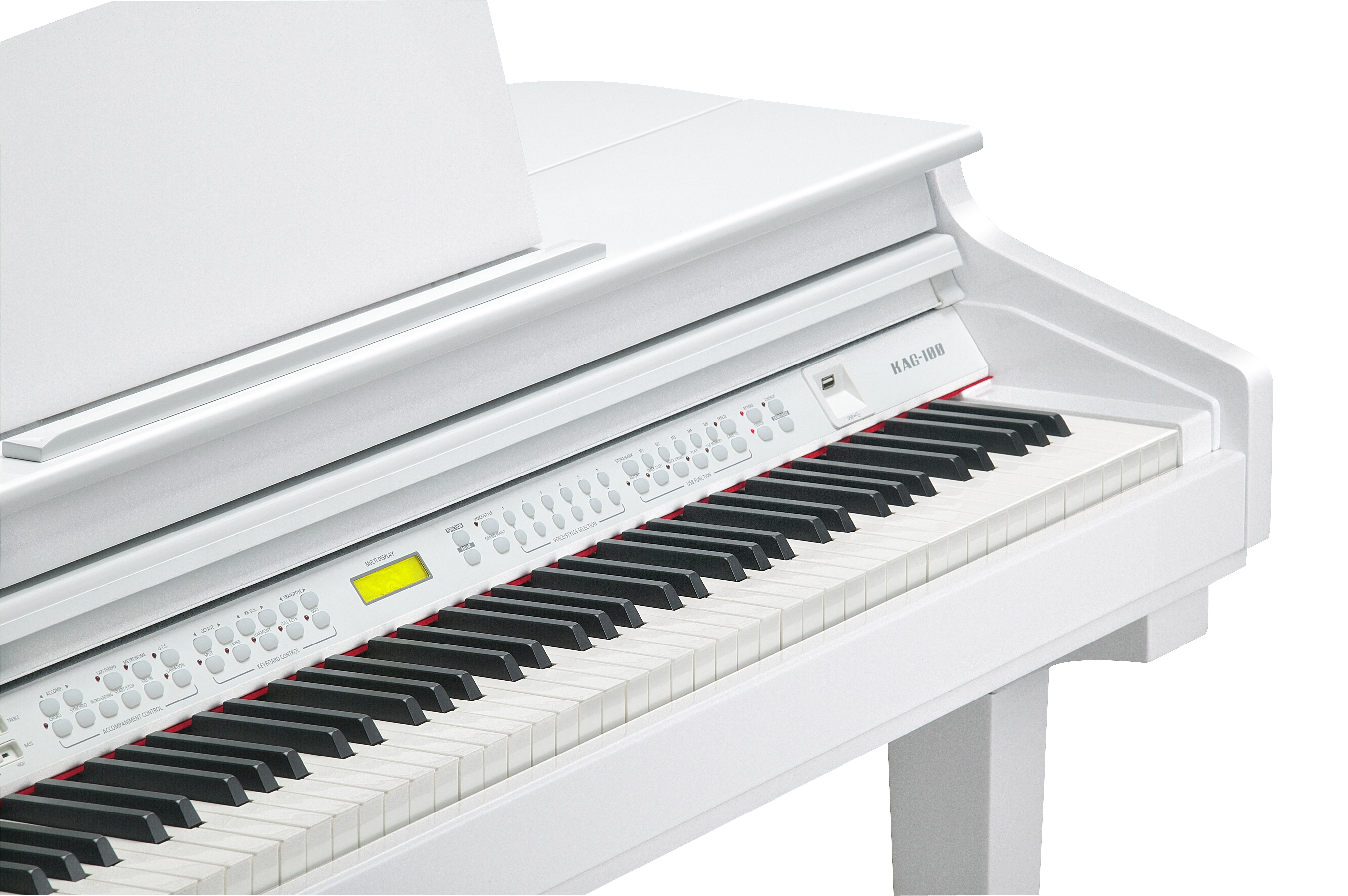 Instrument KAG100 posiada wbudowaną kolekcję utworów do nauki i obsługuje bezprzewodową technologię Bluetooth, co pozwala na granie razem z podkładami muzycznymi przy użyciu smartfona lub tabletu.