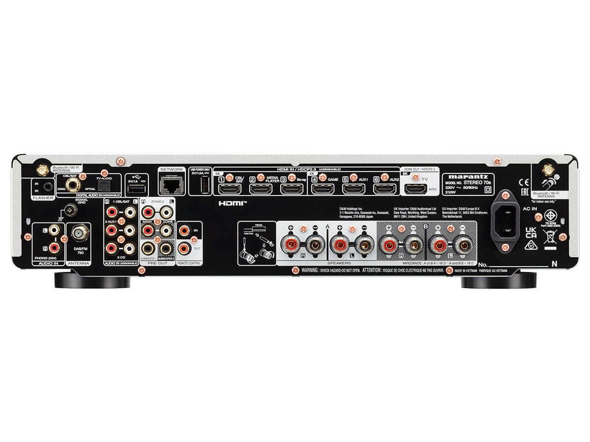 STEREO 70s łączy elastyczność i funkcje dostępne w naszych amplitunerach AV z serii CINEMA w smukłym i prostym amplitunerze 2-kanałowym. 8K HDMI plus ARC ułatwia podłączenie inteligentnych telewizorów, konsol do gier i systemów przesyłania strumieniowego. Wyświetlacz ekranowy wykorzystuje ekran telewizora, aby pomóc w konfiguracji. Obsługa do 2 subwooferów oznacza mnóstwo głębokich basów, nawet w przypadku korzystania z małych głośników półkowych.